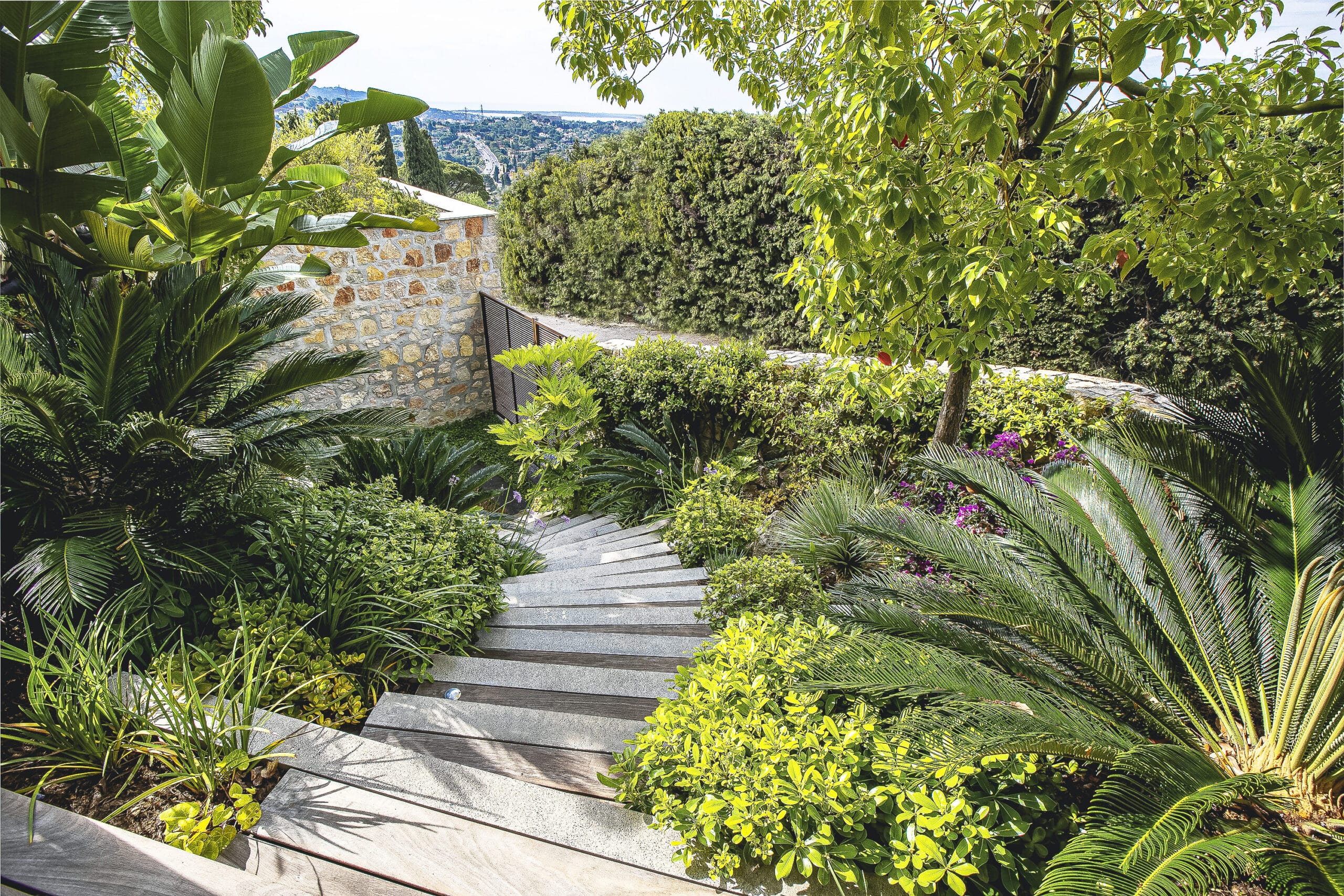 Design of a lush garden around a modern house with a breathtaking view over the bay of Cannes. The aim of this design was to interconnect the dierent living areas despite the steep slope.