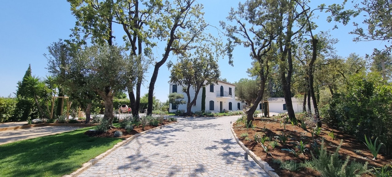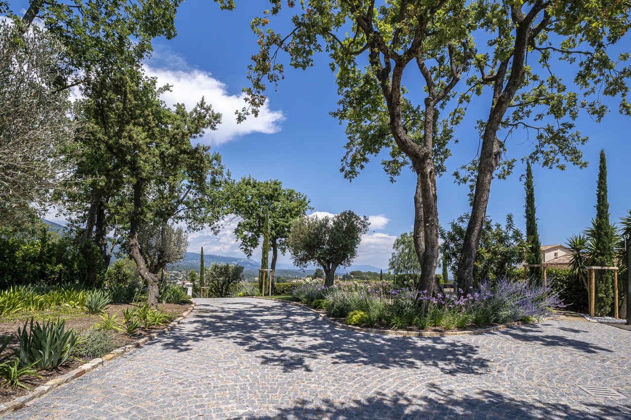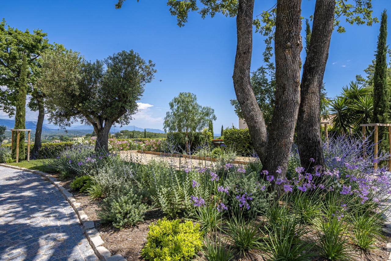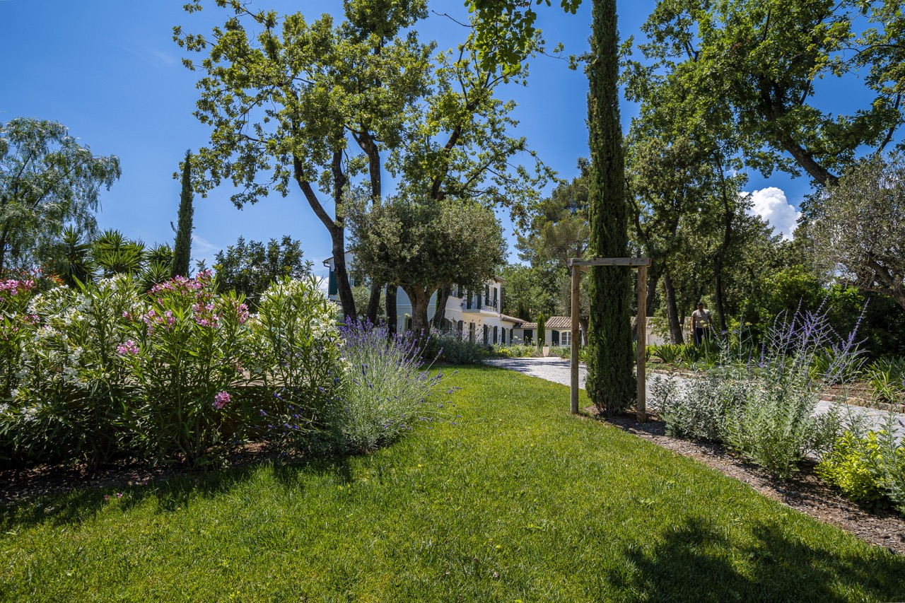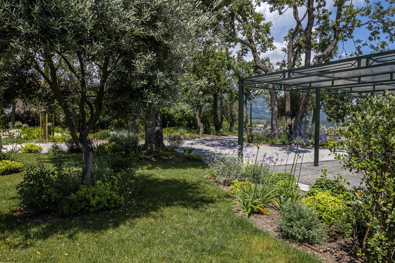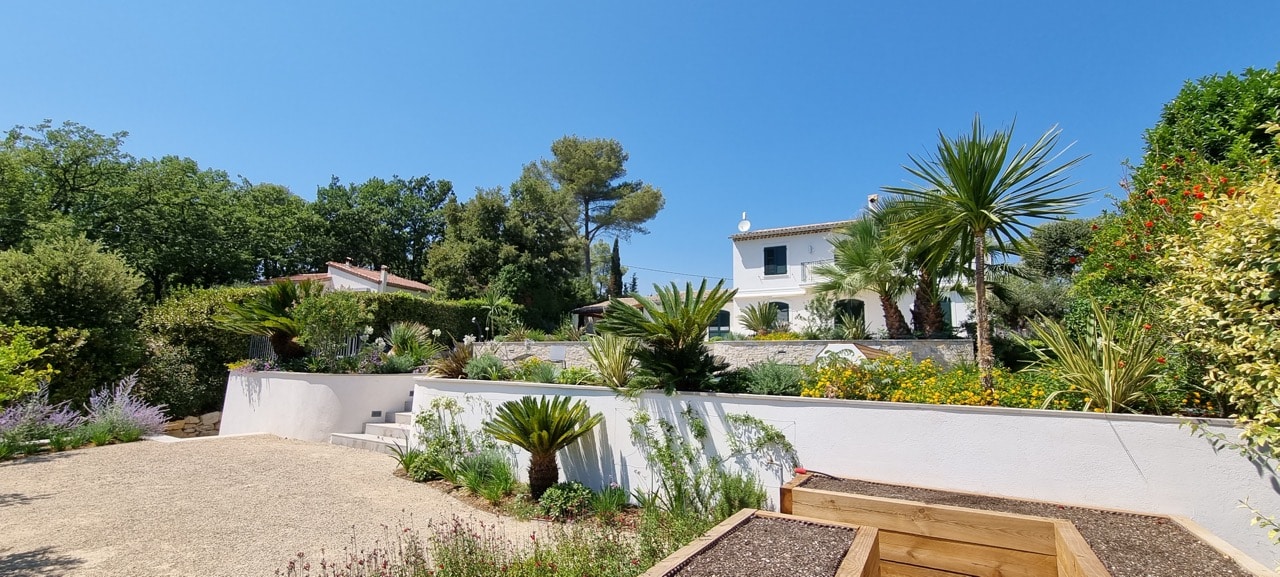 L’entrée de la propriété qui représente près de la moitié de la surface totale du jardin a été réaménagée pour créer un véritable lieu de vie à l’ambiance provençale.